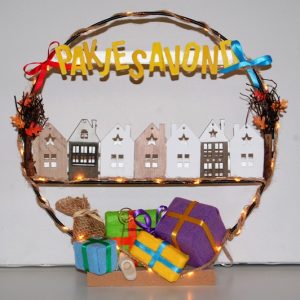 Kleurrijke Sinterklaaskrans voor de gezelligste avond met huisjes, pakjes en houten letters'Pakjes avond'. De krans staat op een voetje en heeft lichtjes. Doorsnede krans 30 cm Excl. baterijen