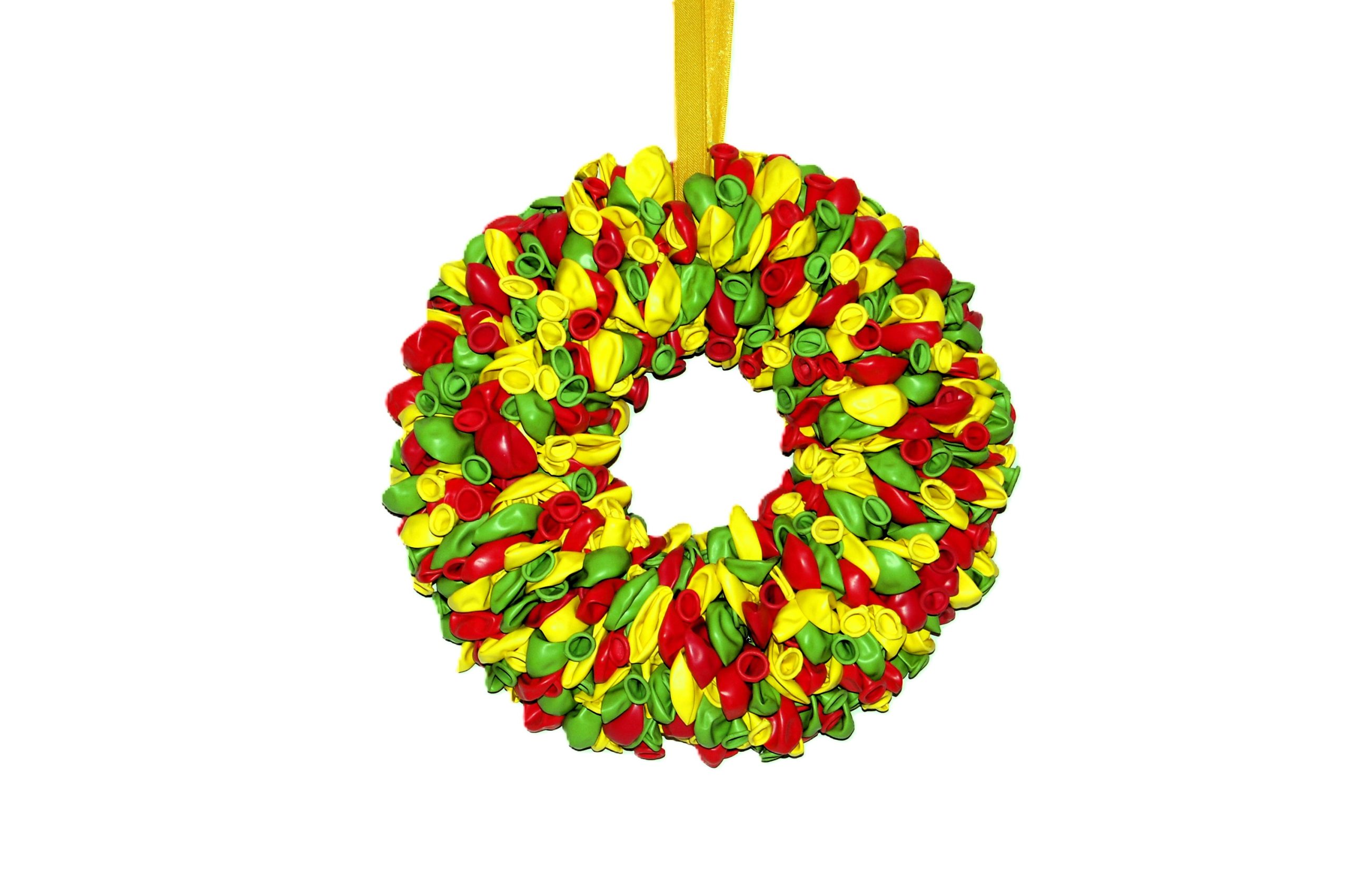Vrolijke ballonnenkrans in de kleuren rood, groen, geel voor een gezellig feestje.