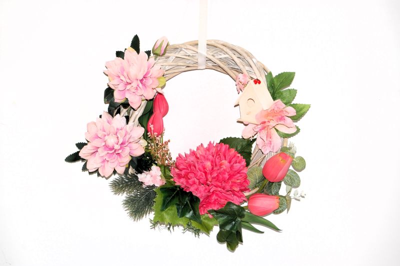 Mooie kleurrijke deurkrans voor binnen en buiten met vogelhuisje.