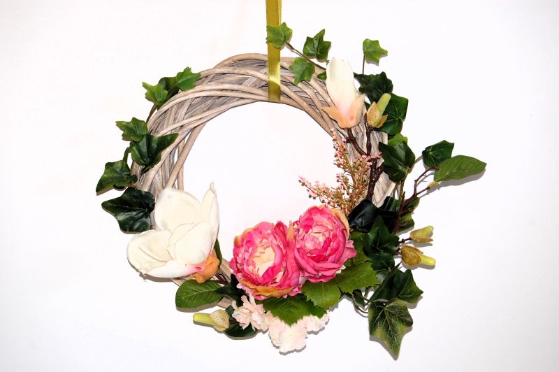 Gezellige deurkrans met magnolia en pioenrozen. Doorsnede krans 30 cm incl. toef +/-40 cm