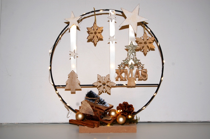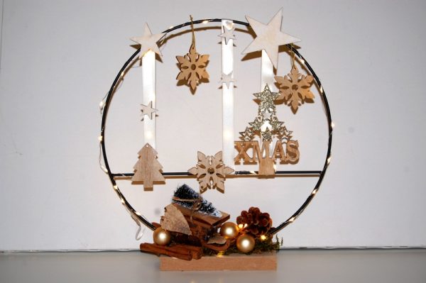 kerstkrans op voet, met lichtjes, crèmekleurige accessoires en sleetje.
