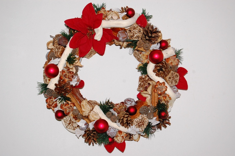 Mooie kerstkrans met gedroogde materialen en zijden kerstroos.