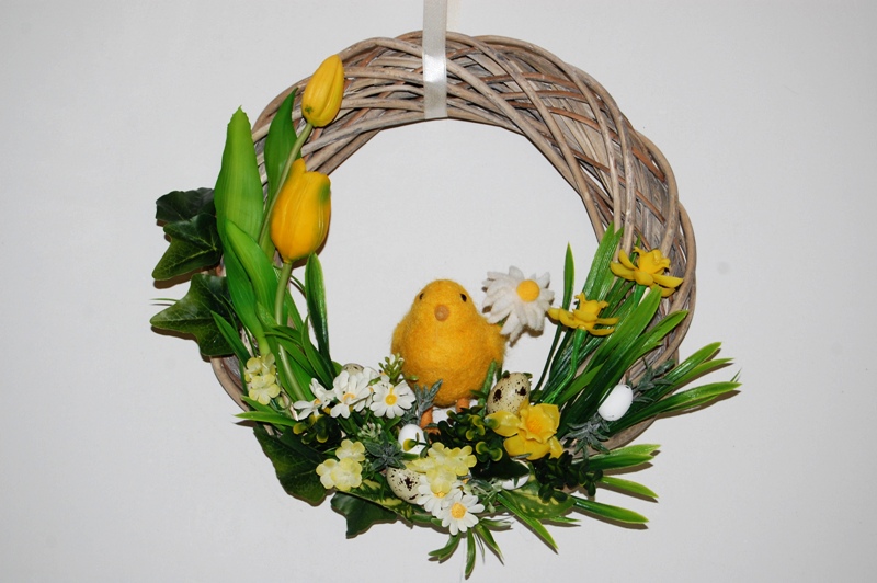 Vrolijke paaskrans vol met eitjes, voorjaarsbloemen en kuikentje.