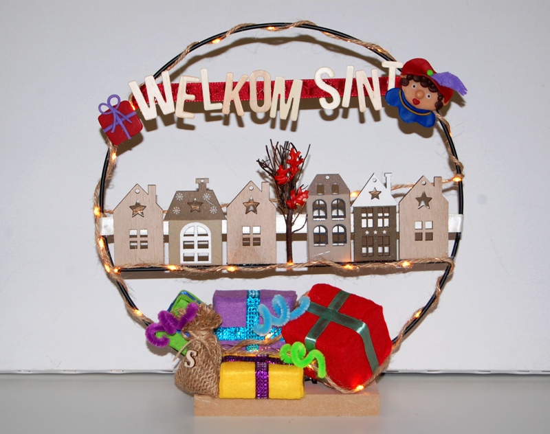 Kleurrijke Sinterklaaskrans voor de gezelligste avond met huisjes, pakjes en houten letters ‘welkom Sint’.